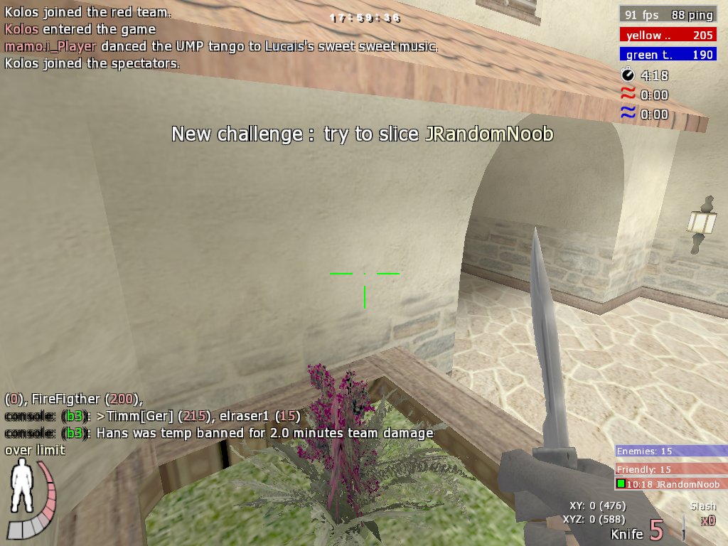 I've been knifing almost exclusively for the last 1.5 days now (only occasionally reaching for a grenade) and finding it enormous fun. I sure have the sick sense of humor needed to enjoy cutting people. Nothing funnier than rushing into a bunch of enemies; when they're done with you, odds are that few teamkills also have occurred>:-) I want to become this scary dude, renowned for his eyepatch and the fact that you see him only after being killed... This dude who gets you when you have your back securely against the wall. This dude who slices you in the middle of the air>:-) Unless you're a stats whore, try it out. It will give you better understanding of the dynamics of a map, and it will make you a better player. To test whether slicing people would bring joy into your heart, pray acquaint yourself with the superb demos from these pages: Watching a good player move fast and low to the enemies and slice them from unexpected positions feels like a scene from an SF movie, from the evil invisible alien's viewpoint. You could almost hear the slithering sound and see the optical warping accompanying this. Note that as you move faster, strafejumping most of the time (you'd better...), you probably start to boot friends and enemies alike quite often. It's especially surprising if you've just realized how hard it is to kick someone... As the knife is by its very nature very difficult a weapon, you have to use more cover, move faster and play more tactically -- rushing headlong into someone will get you killed. When you play a few hours with knife only, going back to your favorite brand of fire-breathing toy feels as if you're a god. One warning: do bind a key for "say !fp", as you'll get teamkilled quite often when in the middle of the enemies. (Knifing sure is an art best practiced alone.) On the bright side, you yourself will almost never teamkill:-) When slicing you discover how clueless most players actually are; when you're not actively attacking them, you can basically run past them without being noticed, then turn back and rape them from behind>:-) One of the coolest things about knife is that it doesn't need reloading -- not even metaphorically, as swinging your arms doesn't use stamina. (There's no real need to fix this "oversight", as it wouldn't add anything to the gameplay.) Another good thing is that if your ratio starts to climb to impossible heights, nobody will suspect you using an aimbot:-P. I wouldn't necessarily enjoy knives-only play, though, as most of the fun in slicing comes from using the advantages knife has over firearms: you rush close to the enemy, so you don't have to aim that precisely; if you can see the enemy, you probably can hit him. You know you're really contributing in the fun factor of the game when the enemies are starting to compliment you:-) Quote: You hit Element`` in the Torso for 44% damage. You hit Element`` in the Arms for 20% damage. You hit Element`` in the Arms for 20% damage. You hit Element`` in the Arms for 20% damage. Element`` was sliced a new orifice by JRandomNoob. /---/ JRandomNoob: :-) /---/ Element``: random rox /---/ analvomit: jrandom<3 /---/ You hit analvomit in the Kevlar for 35% damage. analvomit was sliced a new orifice by JRandomNoob. /---/ (DEAD) analvomit: xD /---/ (DEAD) JRandomNoob: :-)