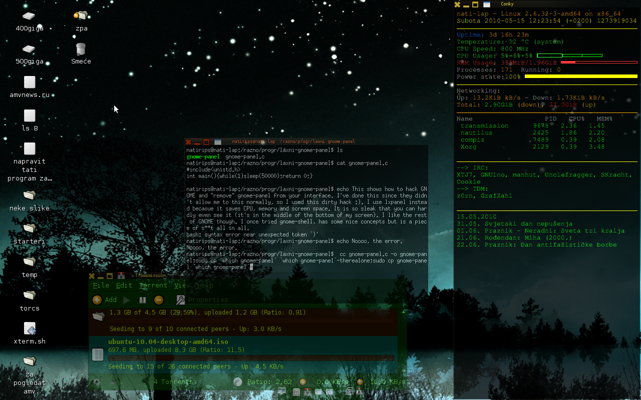 natirips@nati-lap:/razno/progr/laxni-gnome-panel$ echo This shows how to hack GNOME and "remove" gnome-panel from your interface. I've done this since they didn't allow me to this normally, so I used this dirty hack :). I use lxpanel instead becasue it saves CPU, memory and screen space. It is so sleak that you can hardly even see it (it's in the middle of the bottom of my screen). I like the rest of GNOME though. I once tried gnome-shell, has some nice concepts but is a piece of s**t all in all.