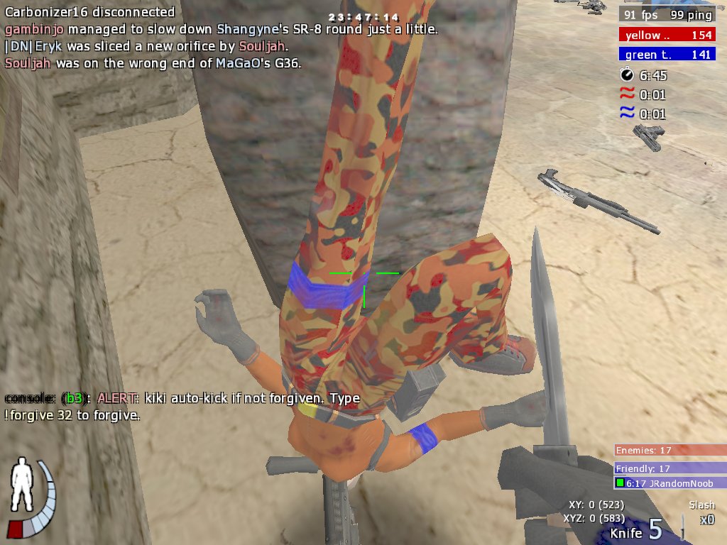 I've been knifing almost exclusively for the last 1.5 days now (only occasionally reaching for a grenade) and finding it enormous fun. I sure have the sick sense of humor needed to enjoy cutting people. Nothing funnier than rushing into a bunch of enemies; when they're done with you, odds are that few teamkills also have occurred>:-) I want to become this scary dude, renowned for his eyepatch and the fact that you see him only after being killed... This dude who gets you when you have your back securely against the wall. This dude who slices you in the middle of the air>:-) Unless you're a stats whore, try it out. It will give you better understanding of the dynamics of a map, and it will make you a better player. To test whether slicing people would bring joy into your heart, pray acquaint yourself with the superb demos from these pages: Watching a good player move fast and low to the enemies and slice them from unexpected positions feels like a scene from an SF movie, from the evil invisible alien's viewpoint. You could almost hear the slithering sound and see the optical warping accompanying this. Note that as you move faster, strafejumping most of the time (you'd better...), you probably start to boot friends and enemies alike quite often. It's especially surprising if you've just realized how hard it is to kick someone... As the knife is by its very nature very difficult a weapon, you have to use more cover, move faster and play more tactically -- rushing headlong into someone will get you killed. When you play a few hours with knife only, going back to your favorite brand of fire-breathing toy feels as if you're a god. One warning: do bind a key for "say !fp", as you'll get teamkilled quite often when in the middle of the enemies. (Knifing sure is an art best practiced alone.) On the bright side, you yourself will almost never teamkill:-) When slicing you discover how clueless most players actually are; when you're not actively attacking them, you can basically run past them without being noticed, then turn back and rape them from behind>:-) One of the coolest things about knife is that it doesn't need reloading -- not even metaphorically, as swinging your arms doesn't use stamina. (There's no real need to fix this "oversight", as it wouldn't add anything to the gameplay.) Another good thing is that if your ratio starts to climb to impossible heights, nobody will suspect you using an aimbot:-P. I wouldn't necessarily enjoy knives-only play, though, as most of the fun in slicing comes from using the advantages knife has over firearms: you rush close to the enemy, so you don't have to aim that precisely; if you can see the enemy, you probably can hit him. You know you're really contributing in the fun factor of the game when the enemies are starting to compliment you:-) Quote: You hit Element`` in the Torso for 44% damage. You hit Element`` in the Arms for 20% damage. You hit Element`` in the Arms for 20% damage. You hit Element`` in the Arms for 20% damage. Element`` was sliced a new orifice by JRandomNoob. /---/ JRandomNoob: :-) /---/ Element``: random rox /---/ analvomit: jrandom<3 /---/ You hit analvomit in the Kevlar for 35% damage. analvomit was sliced a new orifice by JRandomNoob. /---/ (DEAD) analvomit: xD /---/ (DEAD) JRandomNoob: :-)